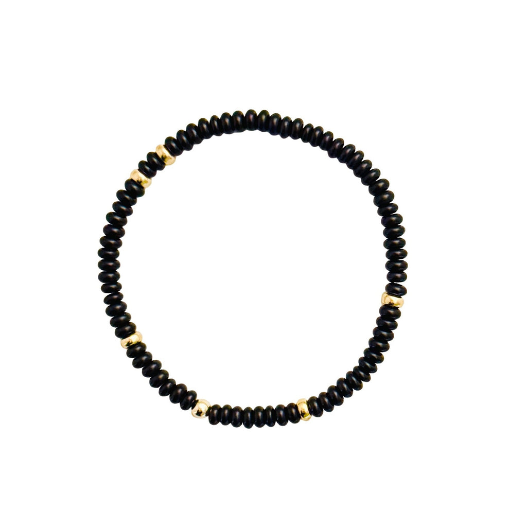 Smooth black agate rondelle beads interspersed with gold beads create this chic, easy to style stretch bracelet.