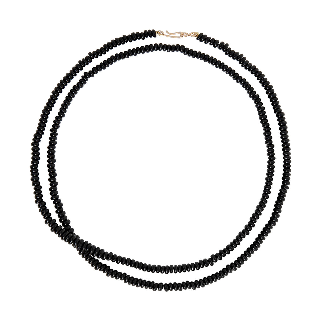 2 for 1: our 30" black agate beaded necklace can be doubled and worn as a choker. Smooth black rondelle beads are strung on silk and and and finished with a hook and eye clasp.