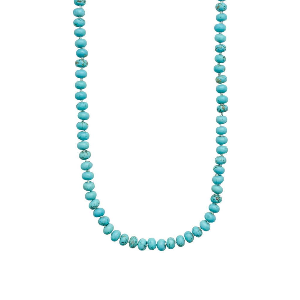 The perfect pop of color to your neck mess. Genuine turquoise rondel beads are crocheted by hand on silk thread. This piece is handmade so please allow 7-10 days for shipping.